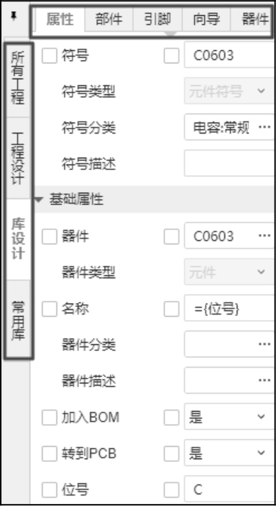 ①属性:用于编辑器件的各种属性,包括符号名称、对应器件、值(如电容的容值)、封装等属性。
