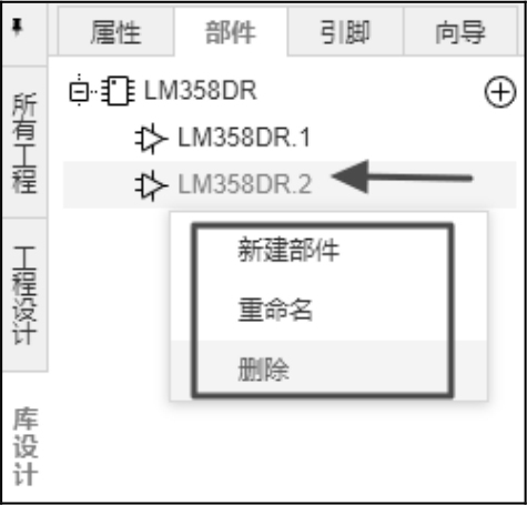 (7)对于元件属性设置,参考上述单部件元件的属性设置即可。单击“左侧栏—库设计—部件”,选中部件后右击可以对其进行新建、删除和重命名,如图3-22所示。此时多部件元件即创建完成,如图3-23所示。