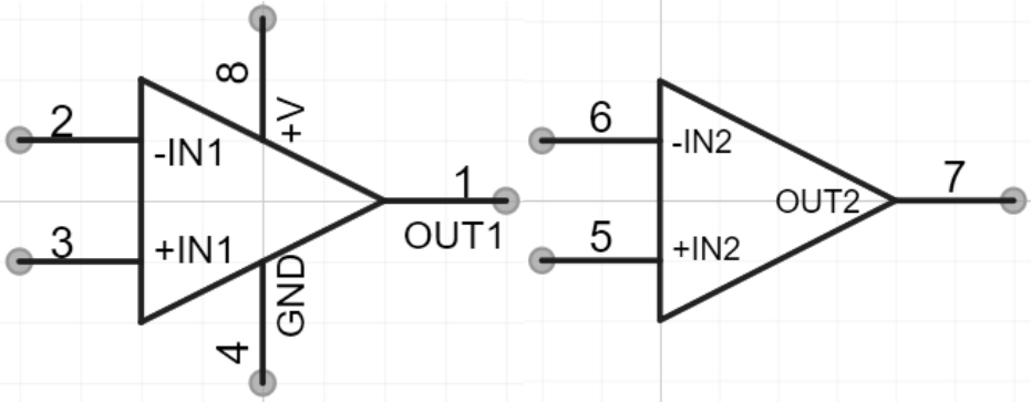 (2)从数据手册图中可以看出,4、8号引脚是电源引脚,1、2、3号引脚加上电源4、8号引脚,是一个具有相对独立功能的部件,5、6、7号引脚是一个部件,因此该元件可以分配为两个子部件。