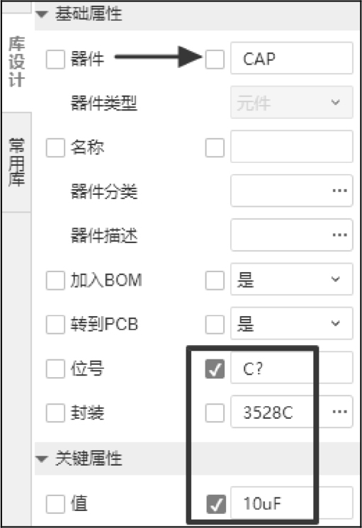 (7)在元件编辑界面的左侧栏,对电容属性进行设置,如图3-29所示:位号设置为“C?”,值填写为“10uF”(在软件中μ为u),器件描述填写为“极性电容”,封装选定为“3528C”(若库中没有此封装可以先不选定,需要创建封装后再选定封装)。到这步即完成了电容的创建。