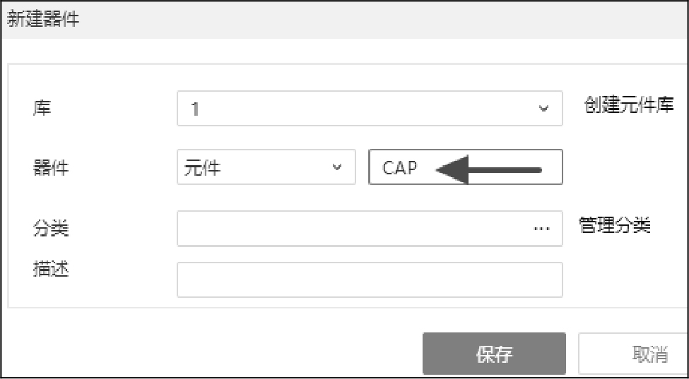 (2)单击“文件—新建—元件”,在弹出的“新建器件”对话框中,“器件”的名称填写“CAP”,如图3-27所示;单击“保存”按钮即完成新建元件。