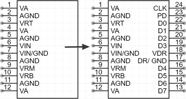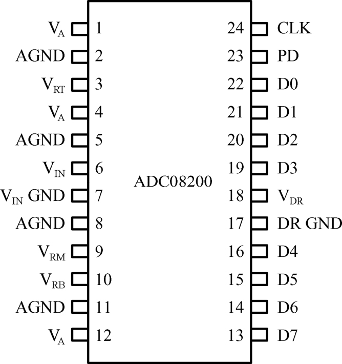 下载ADC08200的数据手册,找到数据手册中介绍引脚功能、引脚编号的部分,据此创建ADC08200的原理图符号。ADC08200为24个引脚的IC类器件,引脚信号分为电源、模拟地、数字地及数据传输信号,如图3-30所示。