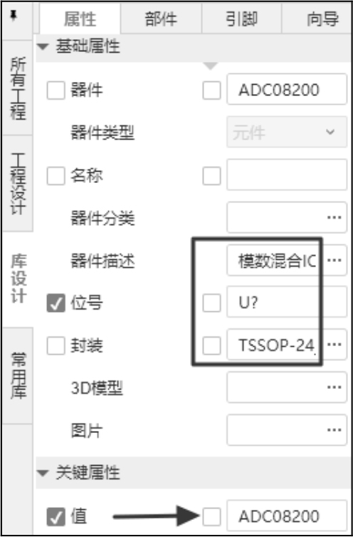 (4)引脚放置完成后,单击“左侧栏—属性”对其属性进行设置,如图3-34所示。位号设置为“U?”,在“关键属性”选项中添加“值”选项,值填写为“ADC08200”,“器件描述”填写为“模数混合IC”,以便识别。此时即完成对此元件的创建。