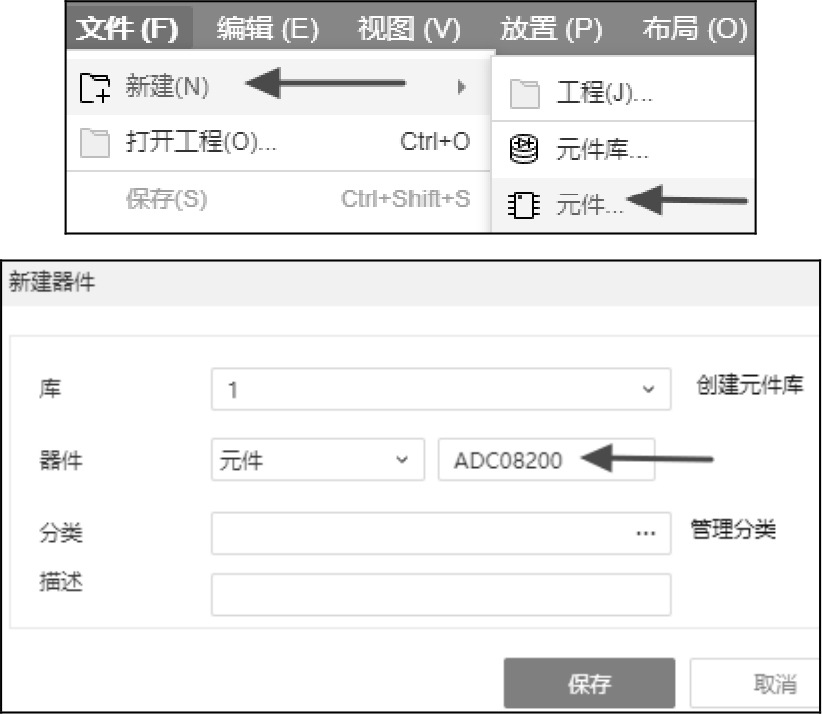 (1)单击“文件—新建—元件”,在弹出的“新建器件”对话框中填写名称“ADC08200”,如图3-31所示。