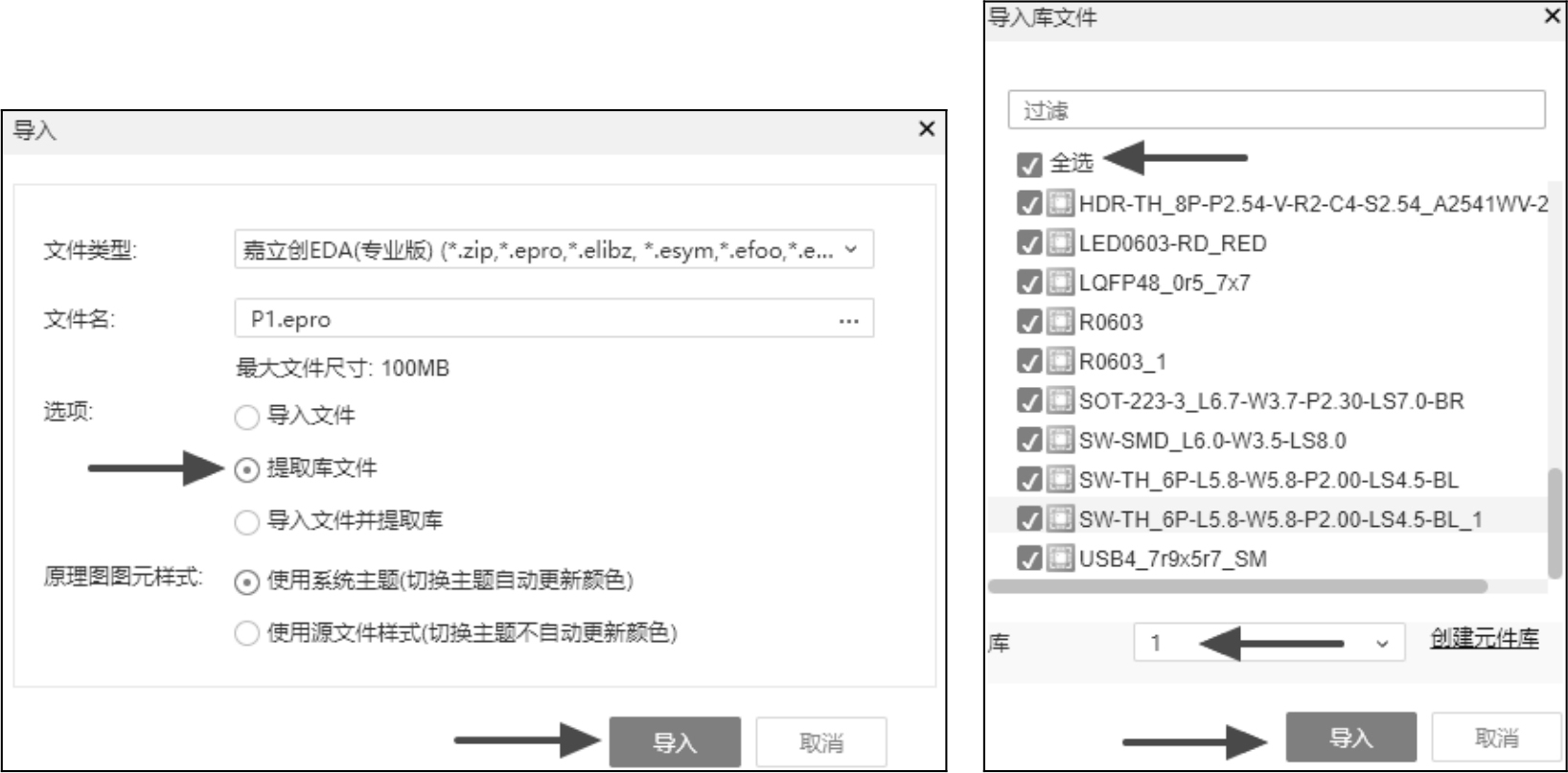 (4)在“导入”对话框中选择“提取库文件”选项并且单击“导入”按钮,在新弹出的对话框内勾选“全选”,在对话框下方的“库”选项中设置完成后,再单击“导入”按钮即可导入元件到指定库中,如图3-43所示。