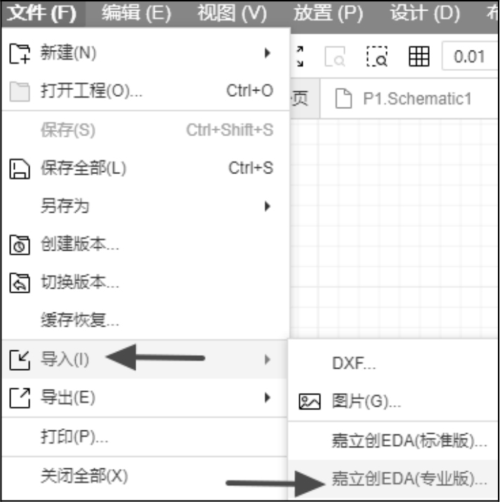 (3)如图3-42所示,单击“文件—导入—嘉立创EDA(专业版)”,弹出选择文件窗口,选中第(2)步创建的压缩包文件,双击压缩包打开文件。