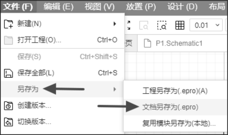 (2)单击“文件—另存为—文档另存为”,如图3-41所示;选中“文档另存为”选项,可将该原理图生成一个压缩包,只能提取该原理图中的元件。选中“工程另存为”选项,可以提取工程里所有原理图中的元件。