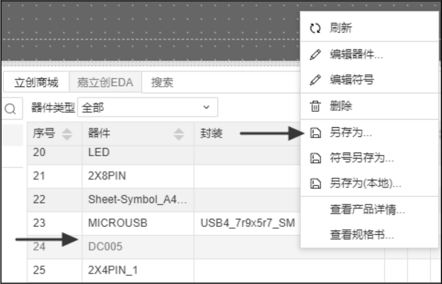 (2)重新打开软件后,在底部面板中单击元件所在的库,然后右击,在快捷菜单中选择“另存为”选项,如图3-45所示。