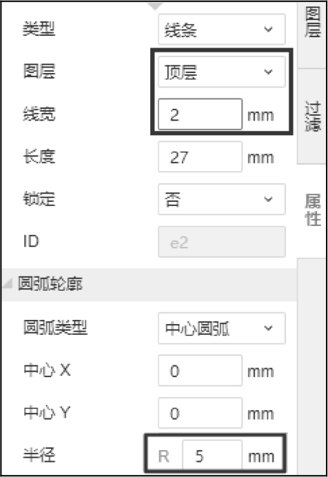 (3)在右侧栏编辑圆弧属性:图层设置为顶层,线宽设置为2mm,半径设置为5mm,如图4-21所示,圆弧半径可更改到需要的尺寸。