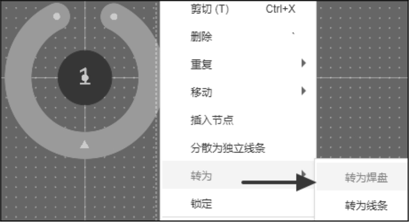 (4)选中圆弧,右击,在弹出的快捷菜单中单击“转为—转为焊盘”,将圆弧生成焊盘属性、阻焊、助焊(钢网),如图4-22所示。此时就完成当前异形焊盘PCB封装的创建,如图4-23所示。