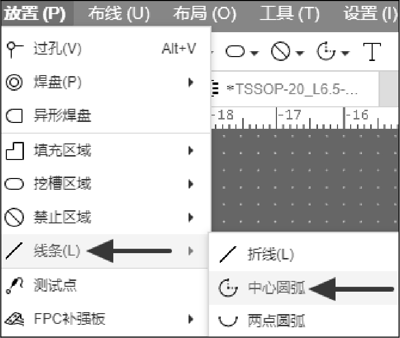(2)单击“放置—线条—中心圆弧”,如图4-20所示,在画布中心放置一个圆弧。