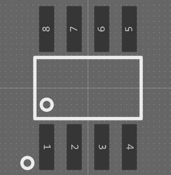 (8)按照数据手册,在顶层丝印层绘制器件主体丝印,丝印线宽一般选择0.15mm;单击“放置—线条—圆形”,在顶层丝印层1号焊盘旁边放置1脚标识。