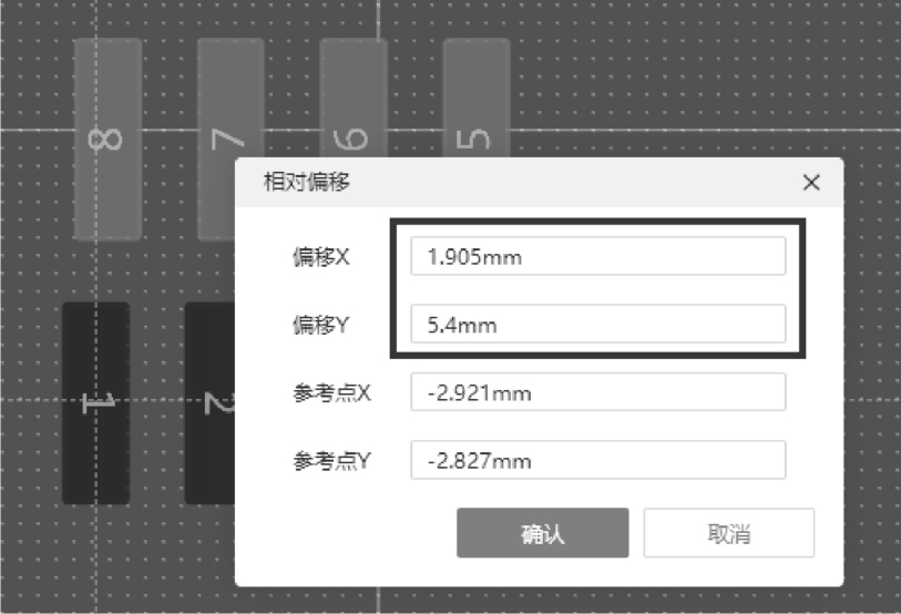 (6)以第(5)步方法从右往左放置第二排焊盘;选中第二排焊盘,单击“布局—偏移—相对偏移”,单击1号焊盘中心,偏移X设置为1.905mm,偏移Y设置为5.4mm,如图4-30所示。