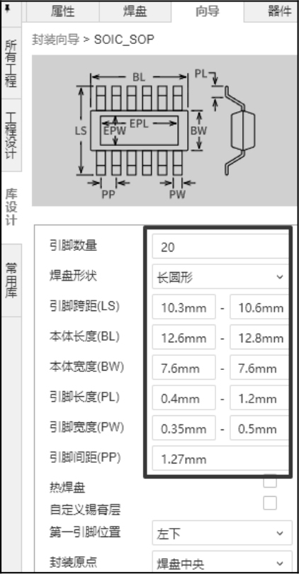 本节利用嘉立创EDA专业版提供的常用封装向导,根据规格书快速创建封装,以利用封装向导创建一个SOP-20封装为例,解析向导创建封装的各步骤。