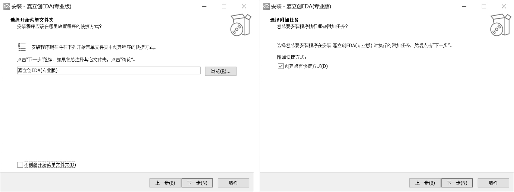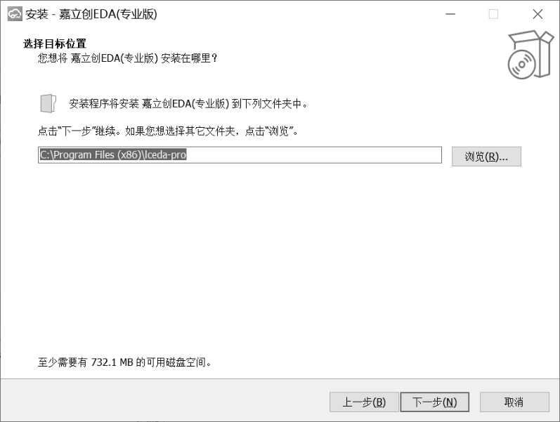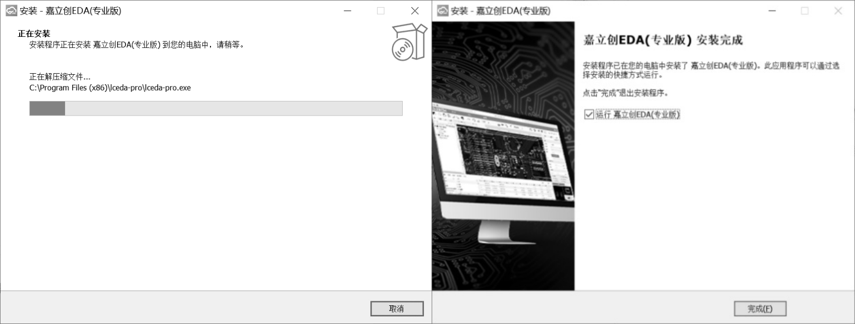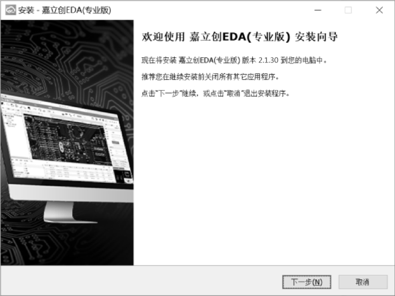 (1)前往嘉立创EDA官网下载嘉立创EDA专业版的安装包,打开安装包所在目录,双击“lceda-pro-windows-x64.exe”安装应用程序图标,安装程序启动,稍后出现如图1-1所示的嘉立创EDA专业版安装向导对话框。