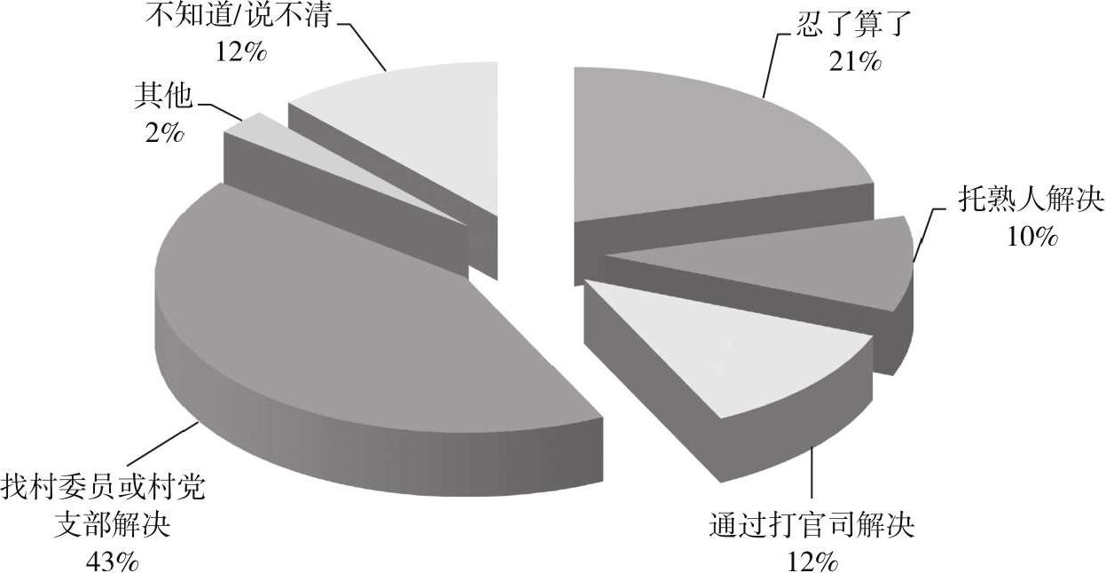 下图是我调研的山东WJ村关于“如果与他人发生了经济纠纷,您会怎么办?”的数据统计。其中,43%的人选择“找村委员或村党支部解决”,10%的人愿意“托熟人解决”,12%的人希望“通过打官司解决”,但当我继续追问下去,才发现他们仅仅有打官司的意愿,而实际上并没有打过官司。