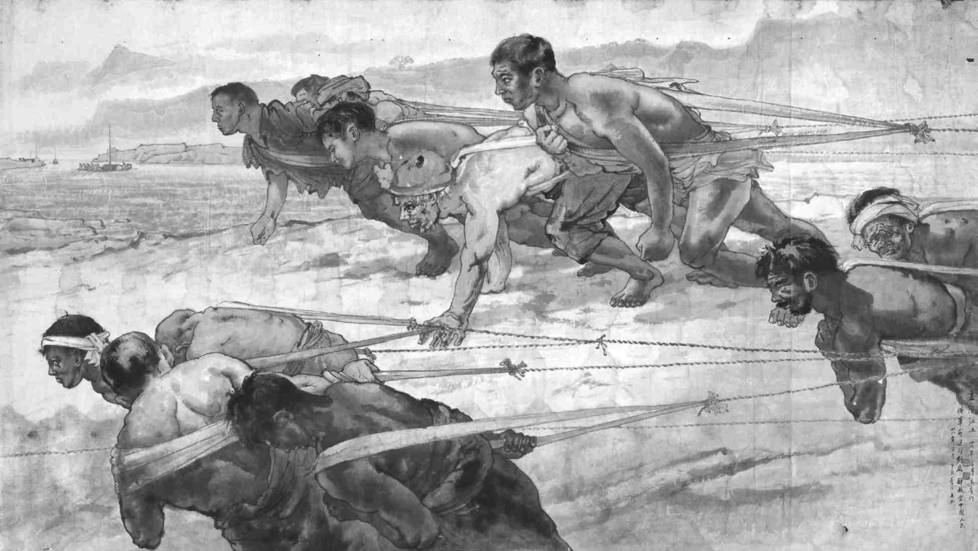 这一时期,他画艰辛万状的嘉陵江纤夫,也画神情淡然的城市劳动妇女;画被日军飞机轰炸后的残垣断壁,也画敌人炸不断的顽强的夜岸灯火。1945年春,时任“中国美术学院”