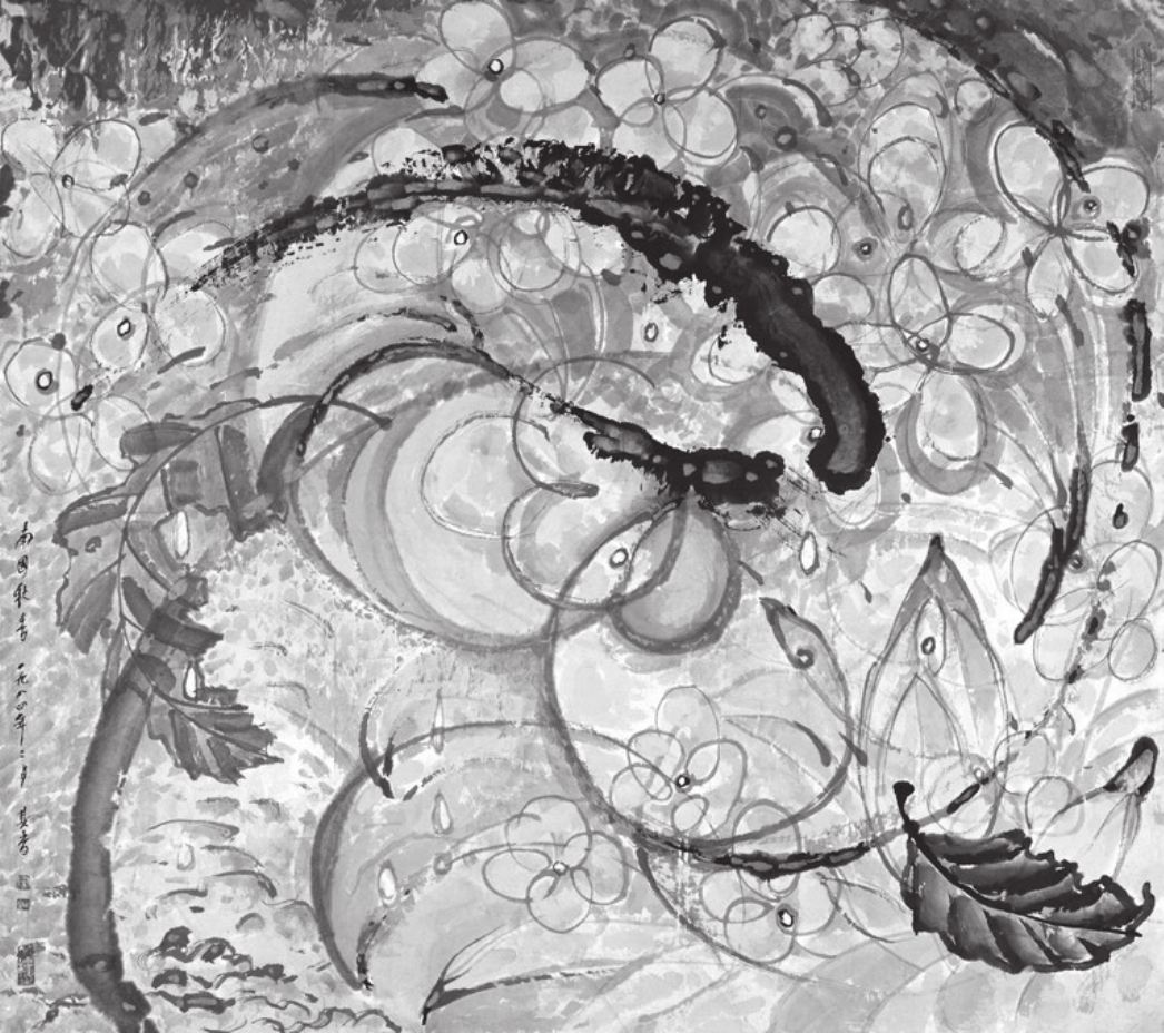 在桂林期间,宗其香还创作了诸多不同风格的水彩画。它们虽景致与风貌不同,但皆与中国画元素、技法紧密结合。将中西画法结合试验,也充分体现了其师徐悲鸿提出的“古法之佳者守之,垂绝者继之,不佳者改之,未足者增之,西方画之可采入者融之”的“引西润中”思想。这一创作理路一直影响了宗其香在20世纪80年代以后在现代艺术方面的延伸探索,如《榕之露》(图9)、《南国秋香》(图10)等一批抽象风格作品的尝试,以及他在学院教学中的人物肖像、静物写生、灯光人体系列等创新实践。尤其是在长年寓居广西期间,他在桂林群山、漓江、邕江之间,探索与发掘了山水画中行云流水的动感,完成了大量的即景速写与写生创作。