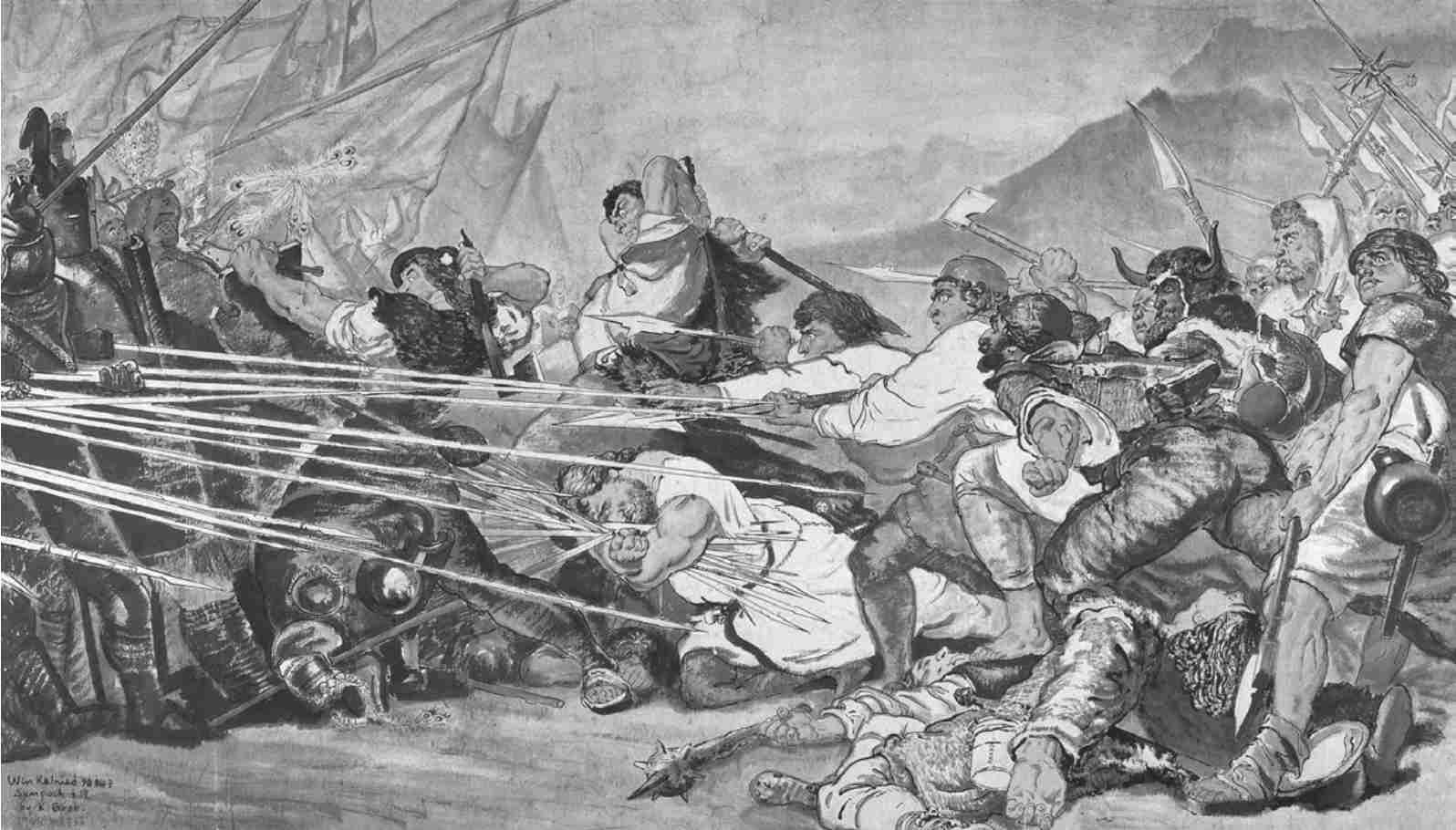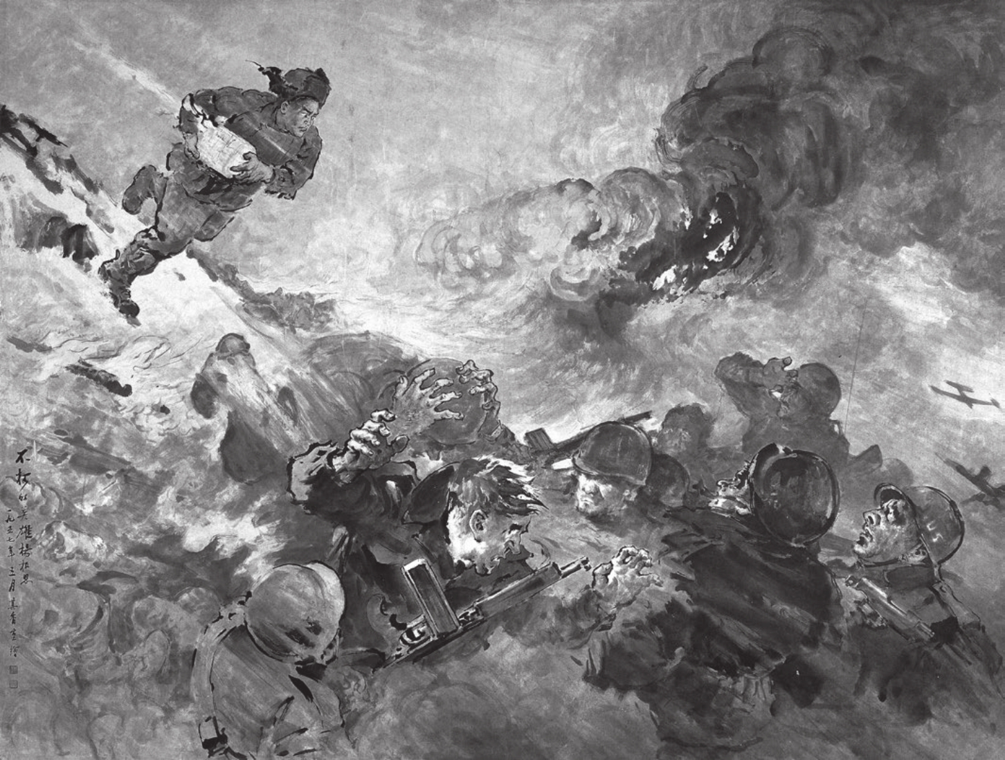 宗其香的艺术创作根植对社会的现实关怀,也源于对世间疾苦的深刻关切。他一生所作的现实题材画作,如编年史般打上了深深的时代烙印,从红军长征、淮海战役到抗美援朝,从十三陵水库、北京展览馆建设工地到首都街景……作为具有强烈社会责任感的画家,其在20世纪40年代创作的《秋风里》《朱门之外》,表现了流离失所的劳苦民众,充满悲凉与苦涩的味道;20世纪五六十年代,他的《不朽的英雄杨根思》(图1)、《巧渡金沙江》《强渡大渡河》讴歌了战场上浴血奋战的英雄人物;《锻工车间》《修船厂》表现了新中国生产建设中干劲冲天的劳动者及其当家做主的热血豪情。
