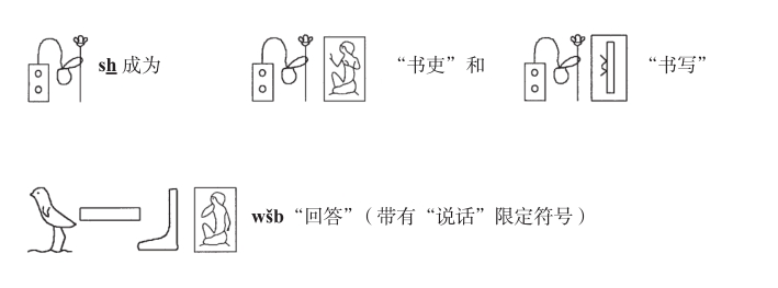 象形文字最有趣的特点之一是符号互补或冗余的频繁使用。许多象形文字由辅助性符号补充,辅助性符号不是单独的符号类型,但具有不同的符号功能。例如,如果我们要在英语中这样做,我们可以通过表示眼睛的符号来识别字母i的正确发音。在古埃及象形文字中,书吏通常以这种方式重复一个主符的最后辅音作为语音补语。有时,他这样做两次,甚至三次,仅仅是为了确保读者理解无误(图2-3)。