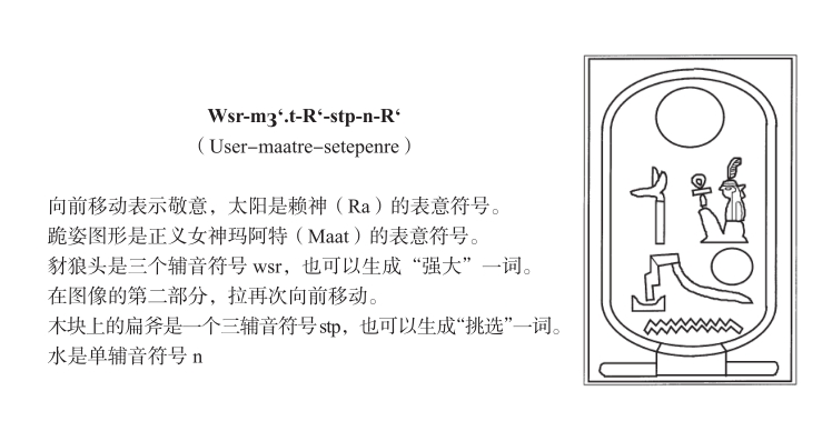 图2-6 古埃及象形文字解读:“赖神的玛阿特很强大,专为赖所挑选。”拉美西斯二世王室头衔(或登基名)可能的翻译,刻在约公元前1250年的一块嵌花砖上