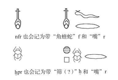 单个的象形文字是从传统的古埃及艺术中提取或精心制作出来的。 8 这种只借用文字的概念和有限功能,而用本土符号来表达自己的语言的倾向在整个文字发展史中不断重复,见本书第三章爱琴海地区音节文字和第七章复活节岛符号相关内容。
