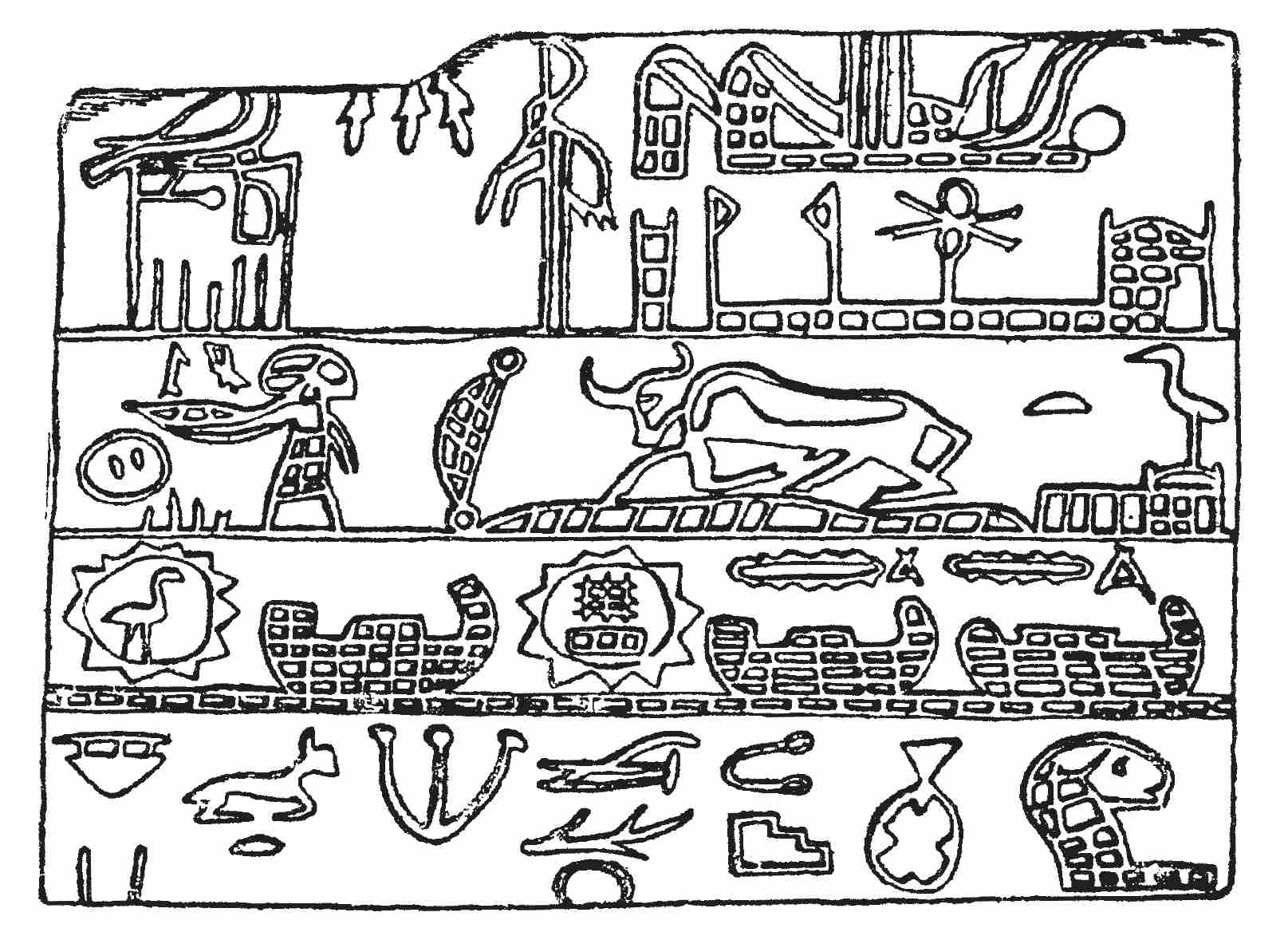 插图2-7 早期古埃及文字的字画谜阶段:阿卡饰板(约公元前2900年),被认为属于传统上埃及第一王朝的建立者美尼斯