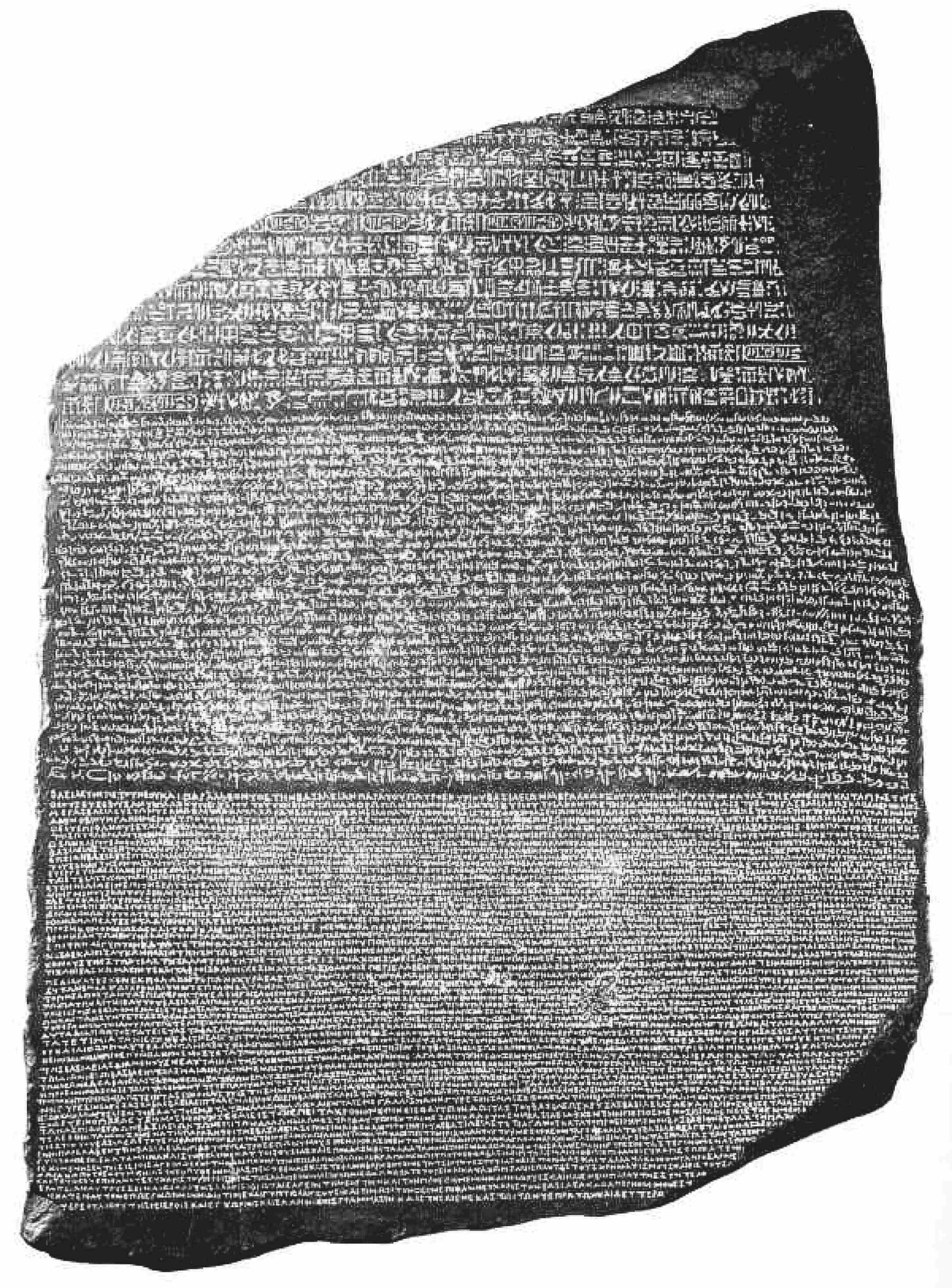 图2-11 罗塞达碑(公元前196年),以3种不同文字写成,是用来纪念托勒密五世的:(上)埃及圣书体;(中)埃及世俗体;(下)希腊文字