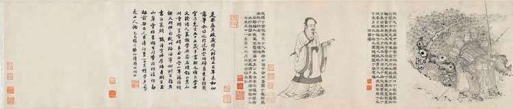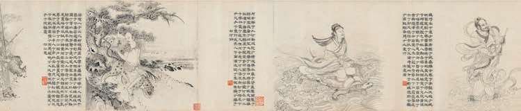 余近得邦达所藏张叔厚《九歌卷》一本,笔精墨妙,无上佳品。每段有褚士文书《九歌》 (图1—4) ,共十一节。见陆氏《吴越所见书画录》著录。考张氏画,近世存者甚鲜。《九歌》之可考者共有三卷,一存故宫,一存苏州顾氏海野堂,一即余卷也。