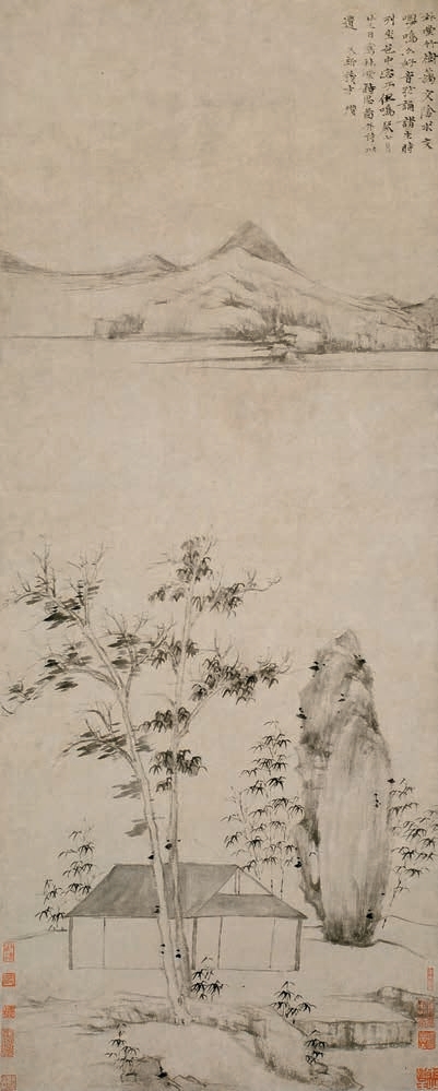 余所见山樵画计有十四幅:庞莱臣氏藏《葛山翁移居图》《夏日山居图》《丹山瀛海卷》,故宫藏《谷口春耕》,张葱玉氏藏《惠麓小隐》,狄氏平等阁藏《青卞图》,张学良氏藏《林泉清集》,徐俊卿氏《西郊草堂》,朱靖侯氏藏《煮茶图》,徐邦达藏《茅屋冬青》(时人多不识其真)与《林泉清集》有相同处可证,北平关冕钧氏藏《素庵图》,某氏藏《修竹远山》(旧印见《神州大观》,及余藏《林麓幽居》,周湘云藏大幅山水,佚其名(见日本《唐宋元明名画集》),苏州顾氏所藏当有数幅未见。〔眉批注:虚斋尚有《蓝田山庄》一幅,余近得《为怡云上人》一幅。〕