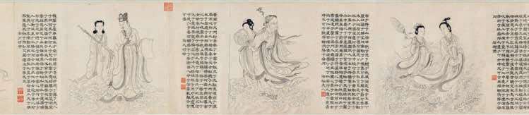 ,长二丈余,白描甚精细,乃临仇氏本也,有文徵明小楷《飞燕外传》及王世贞等诸名人跋。