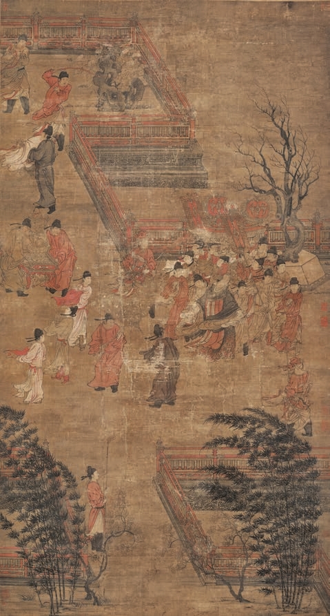 汲古阁见绢本人物长卷一,设色,有项子京早年收藏印。设色鲜丽,绢底洁净,审其人物相貌及用笔设色等,似出仇十洲早年手笔。仇氏早年曾馆项氏,此大约为项氏所作,惜未具名款,为憾事耳。