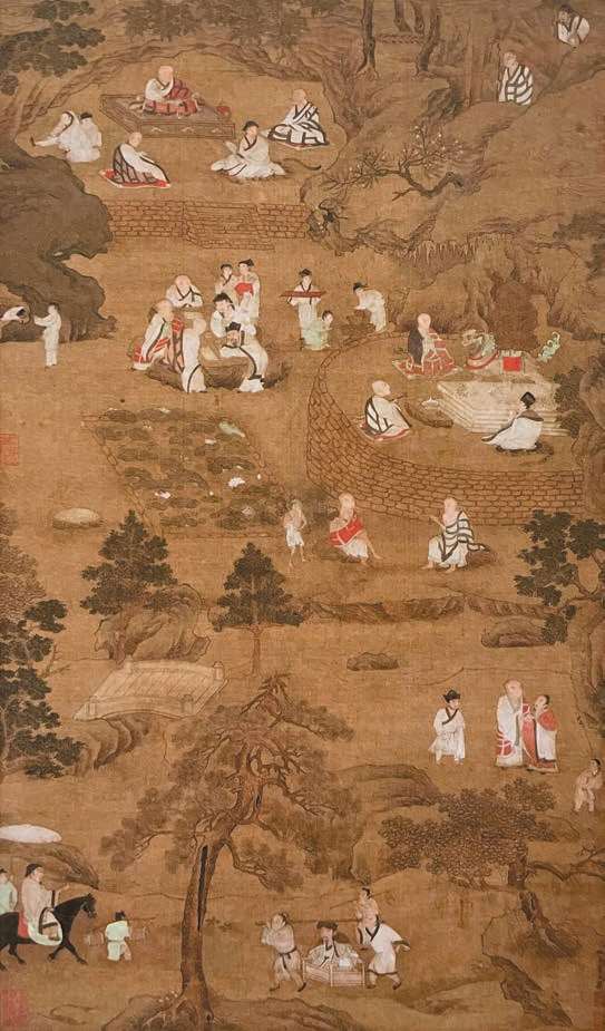 余近得沈石田《山水》绢本一幅,平平。仇英《莲社图》 (图 1-9) 一幅,笔墨甚佳,惟因画在绢素,且被装池洗坏,色泽 欠鲜。 故所值只一千金,可谓廉极。 已退去,为可惜耳。