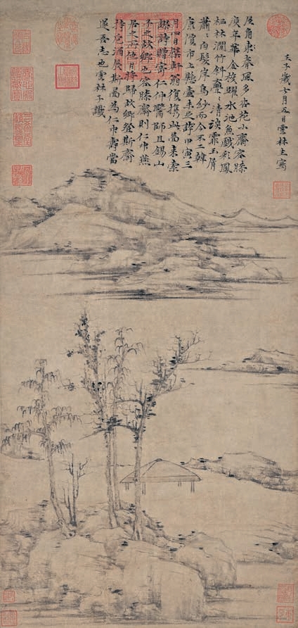 五月八日。得云林《林堂诗思图》 (图1—13) ,五数(金五五)。纸尚洁白,稍有虫蚀。余所见倪画当以此为最洁净。见《式古堂汇考》。昔有王烟客藏本,在《小中见大》烟(客)临古本中有此一幅,该册原本大约均为思翁、烟客等所有名迹而缩临者,今真迹尚存者恐不满十幅,而此幅竟于无意中获得。神物来归,洵非偶然也。
