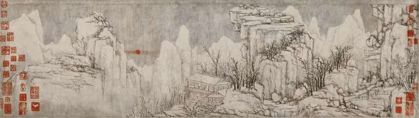 ,用笔甚刚,疑非真笔,待考。又见新罗画松长卷墨色飞舞,亦此老精品。