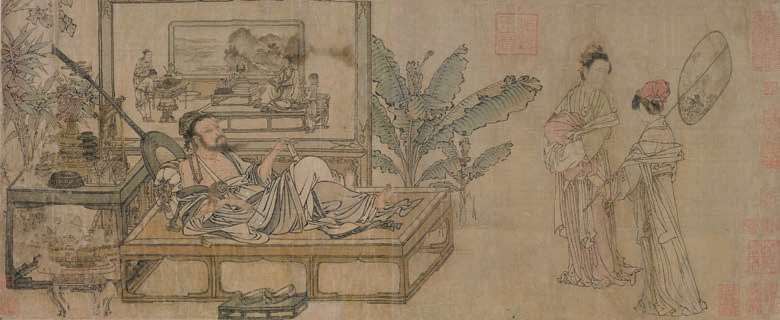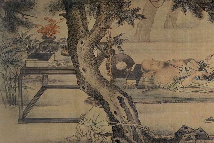汲古阁曹友今购得高江村著录宋刘松年《梦蝶图》绢本横看,上有怡亲王、式古堂、安仪周等图记。一老人酣睡松下石抬上,童仆倦卧松根,意态闲适,笔墨精妙。签题“宋刘松年《梦蝶销夏图》”,犹是江村手笔。盖当时《梦蝶》 (图 1-5) 《销夏》 (图1—6) 属两图。此乃《梦蝶》一幅,已为后人裂为两卷。《销夏》一图尝见于张葱玉处,尺寸与此相同,而下角有"毌道”二字隐石隙,为湖师昔年所发见,定为刘毌道而非刘松年。此幅无款而 尺寸相同 ,笔墨亦相似,其为毌道无疑矣。
