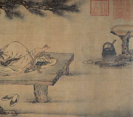 汲古阁曹友今购得高江村著录宋刘松年《梦蝶图》绢本横看,上有怡亲王、式古堂、安仪周等图记。一老人酣睡松下石抬上,童仆倦卧松根,意态闲适,笔墨精妙。签题“宋刘松年《梦蝶销夏图》”,犹是江村手笔。盖当时《梦蝶》 (图 1-5) 《销夏》 (图1—6) 属两图。此乃《梦蝶》一幅,已为后人裂为两卷。《销夏》一图尝见于张葱玉处,尺寸与此相同,而下角有"毌道”二字隐石隙,为湖师昔年所发见,定为刘毌道而非刘松年。此幅无款而 尺寸相同 ,笔墨亦相似,其为毌道无疑矣。