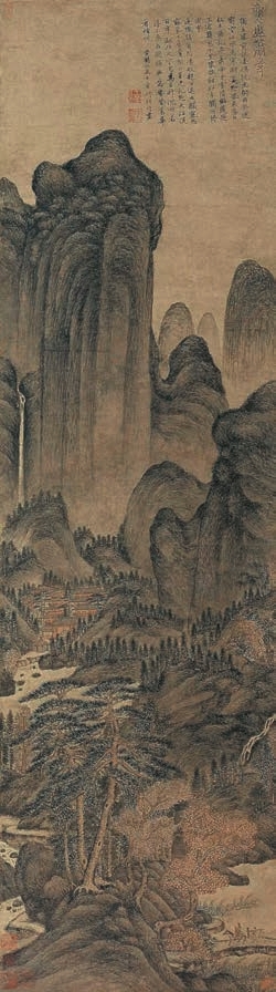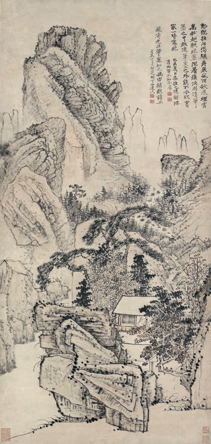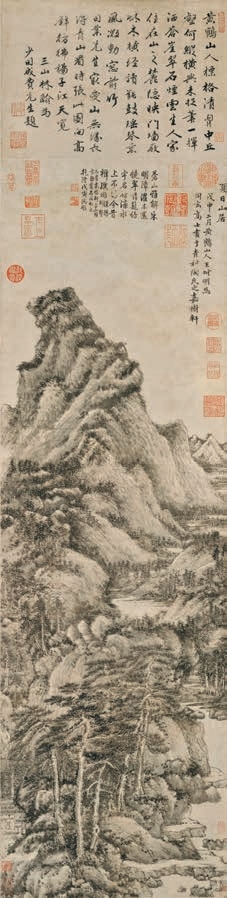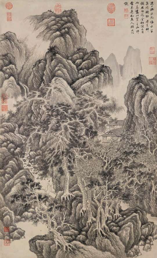 得麓台《石室山房图》方幅,为麓台中之精品。人皆以其幅式、纸色不佳轻之,重宾轻主,不得不为古人叫冤也。