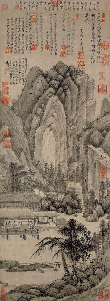 ,纸尚洁净,墨气浑沦,高约四尺,明代装裱,所谓“元气淋漓幛犹湿”,此图足以当之,叔明画中确为第一名笔也。又观倪云林《怪石丛篁》