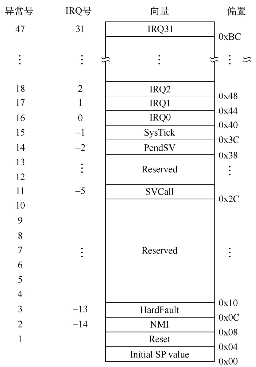 向量表包含用于所有异常句柄的堆栈指针和起始地址(也称为异常向量)。向量表中异常向量的顺序如图2.22所示。每个向量的最低有效位必须为1,用来指示异常句柄是用Thumb代码编写的。