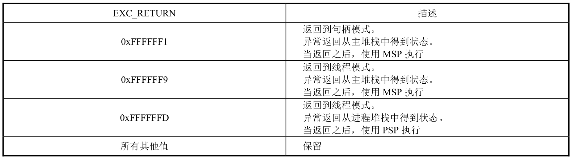 处理器提取向量,从向量表中读取异常句柄的起始地址。当完成压栈后,处理器开始执行异常句柄。同时处理器将EXC_RETURN值写入LR。这指示哪个堆栈指针对应于堆栈帧,以及处理器在进入异常之前所处的模式。