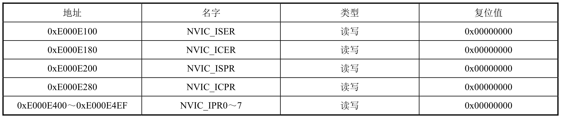 NVIC中的中断寄存器集如表2.12所示。本节详细介绍这些寄存器的功能,以帮助读者更好地理解处理器异常的原理和控制机制。