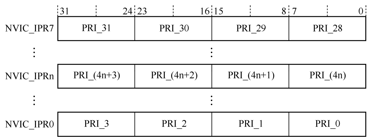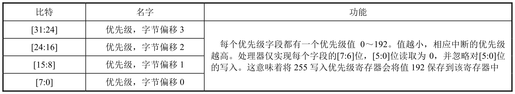 中断优先级寄存器(NVIC Interrupt Priority Register,NVIC_IPR)0~7为每个中断提供了8位的优先级字段。这些寄存器只能通过字访问,每个寄存器包含4个优先级字段,这8个寄存器的位分配如图2.31所示,这些位分配的功能如表2.13所示。