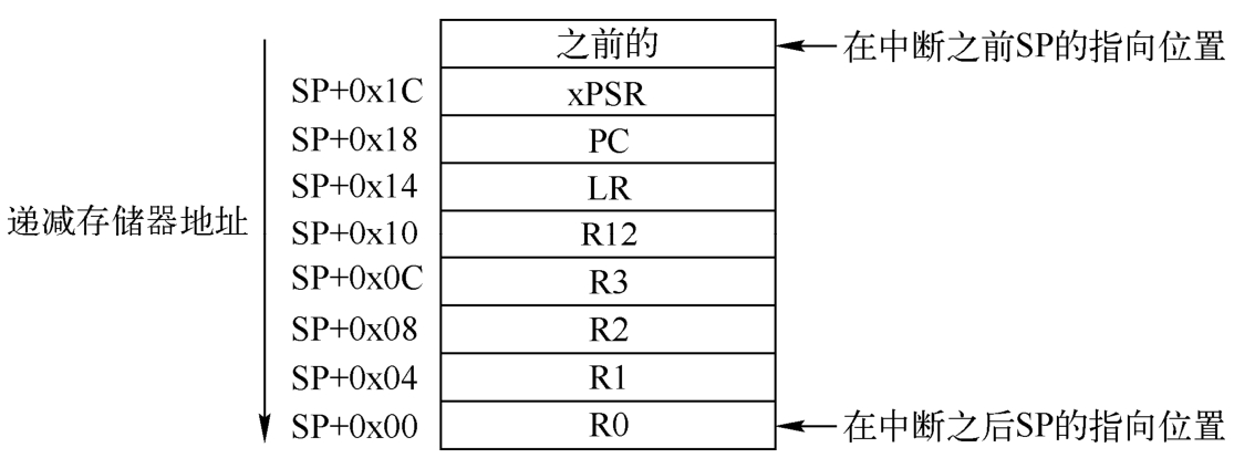 在压栈之后,堆栈指针指向堆栈中的最低地址。堆栈帧与双字地址对齐。堆栈帧包含返回地址。这是被中断打断的当前正在执行程序的下一条地址。当从异常返回时,将该值恢复到PC,这样可以继续执行被打断的程序。