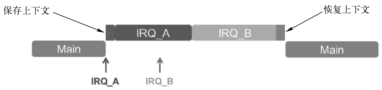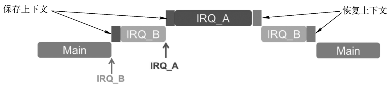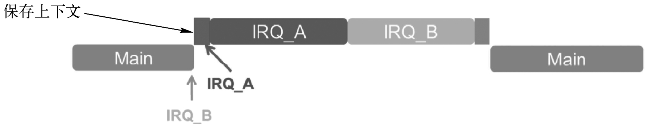 如图2.23所示,当处理器正在处理一个中断,一个具有更高优先级的新请求到达时,新的异常可以抢占当前的中断,称之为嵌套的异常处理。