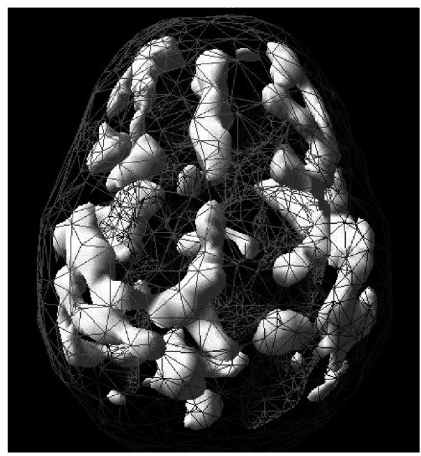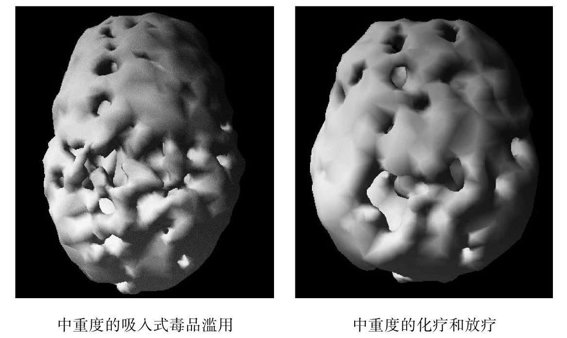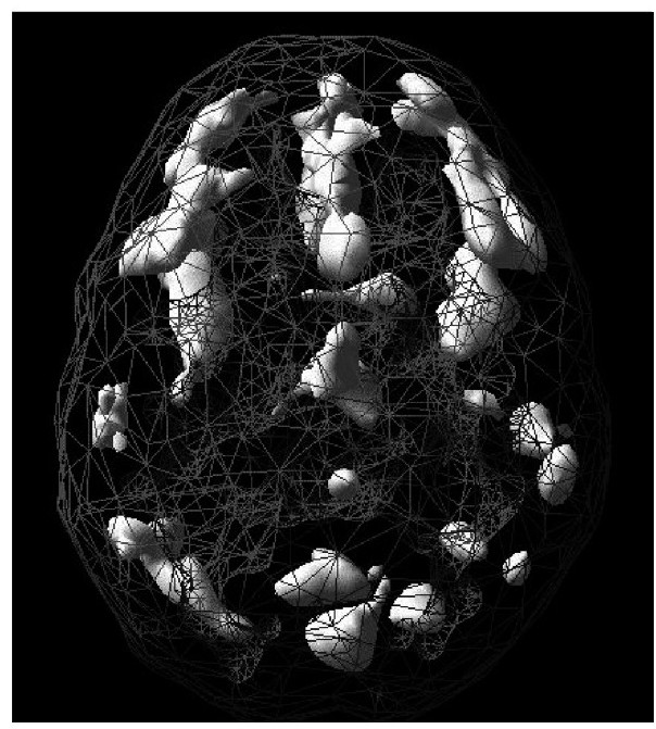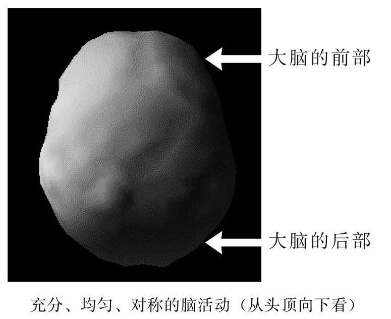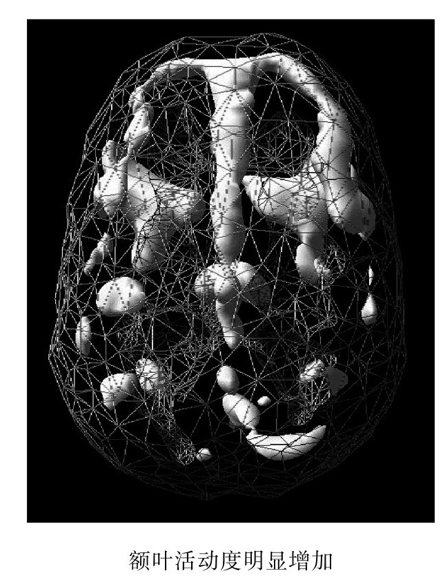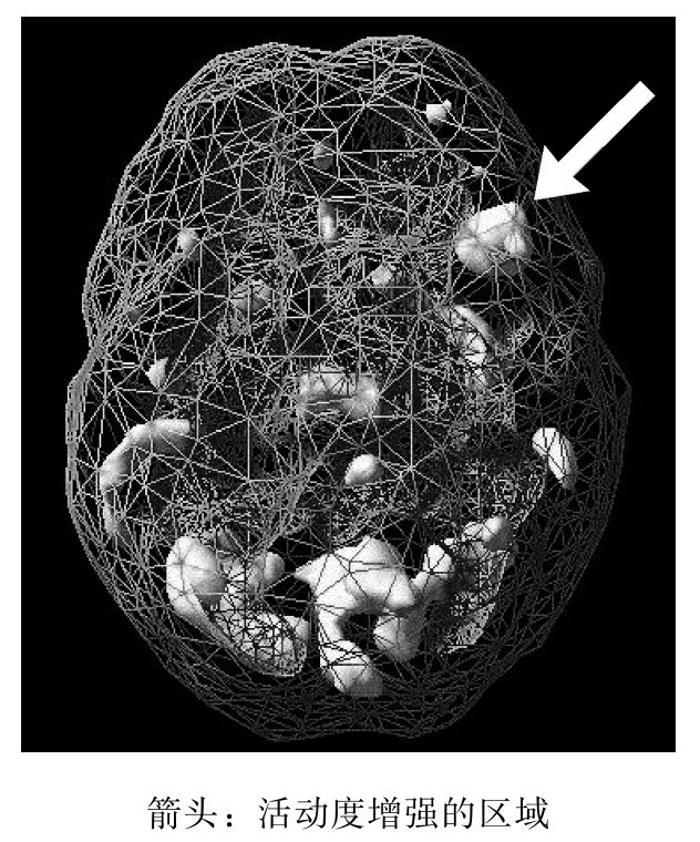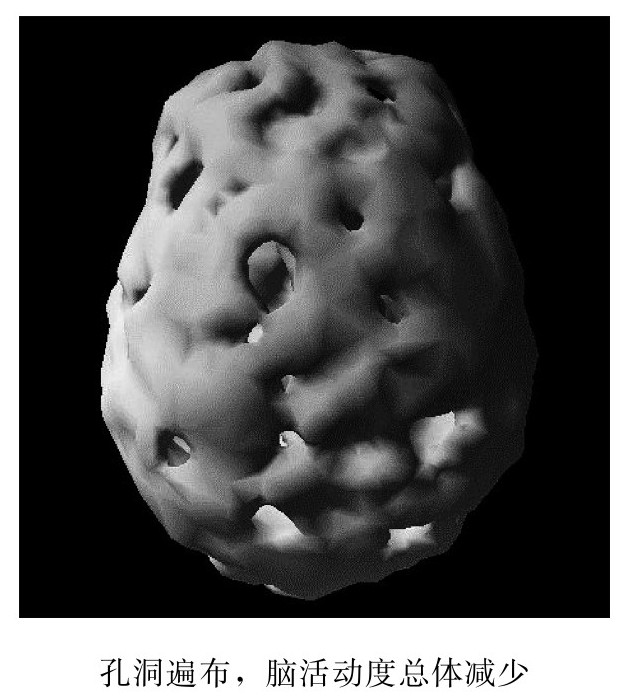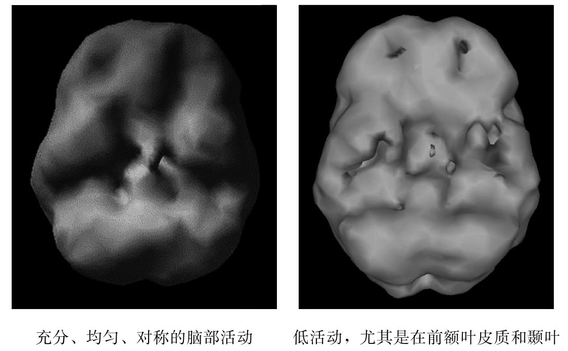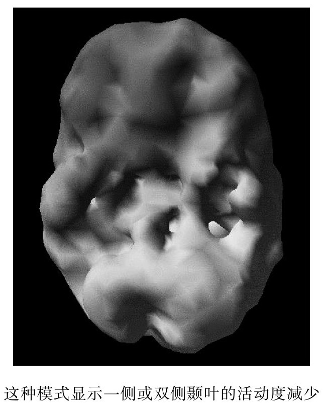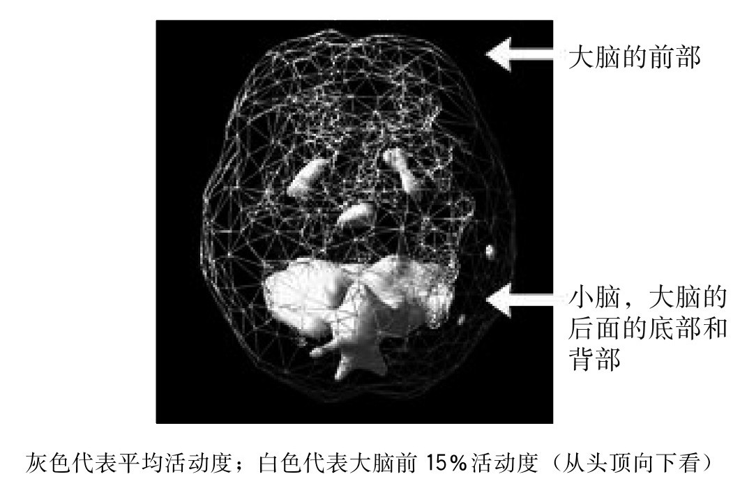 在主动式SPECT扫描中,灰色背景代表平均活动度;白色代表活动度在前15%的区域。健康人的扫描结果中,最活跃的脑区通常在大脑后部的底端,即小脑。因为该区域包含了50%的脑神经元。