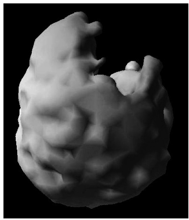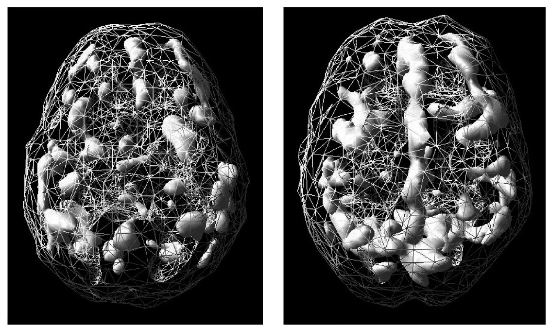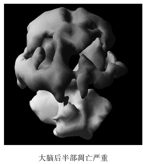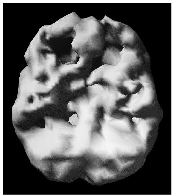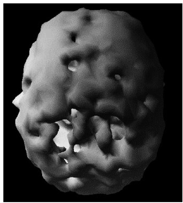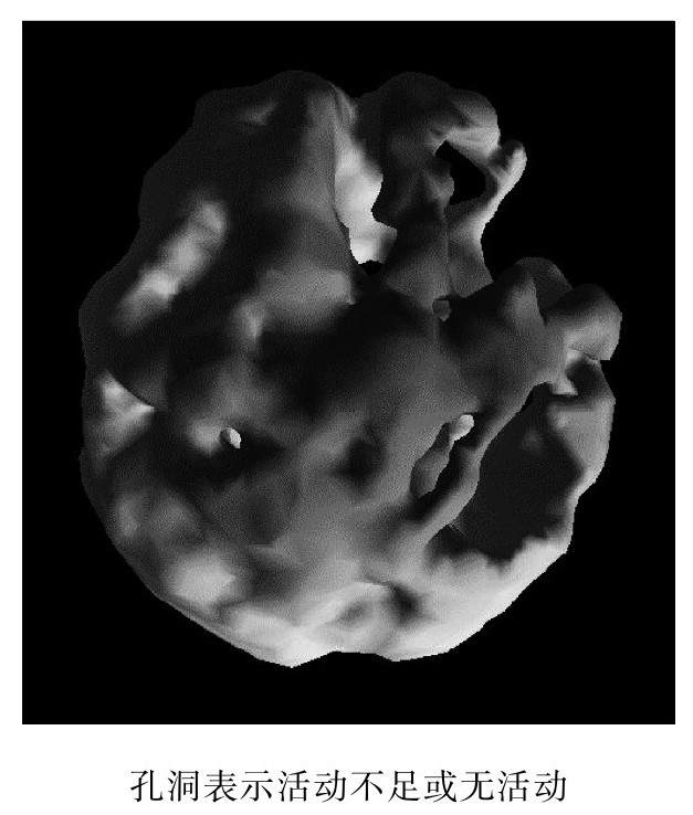 第一张是健康人的结果,显示了大脑的外表面。它显示出完整、均匀、对称的活动和血流。
