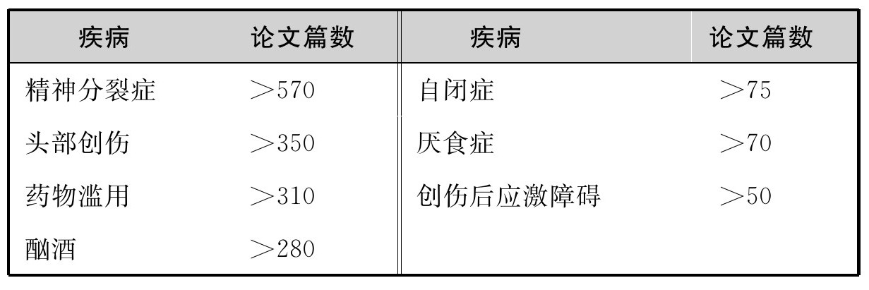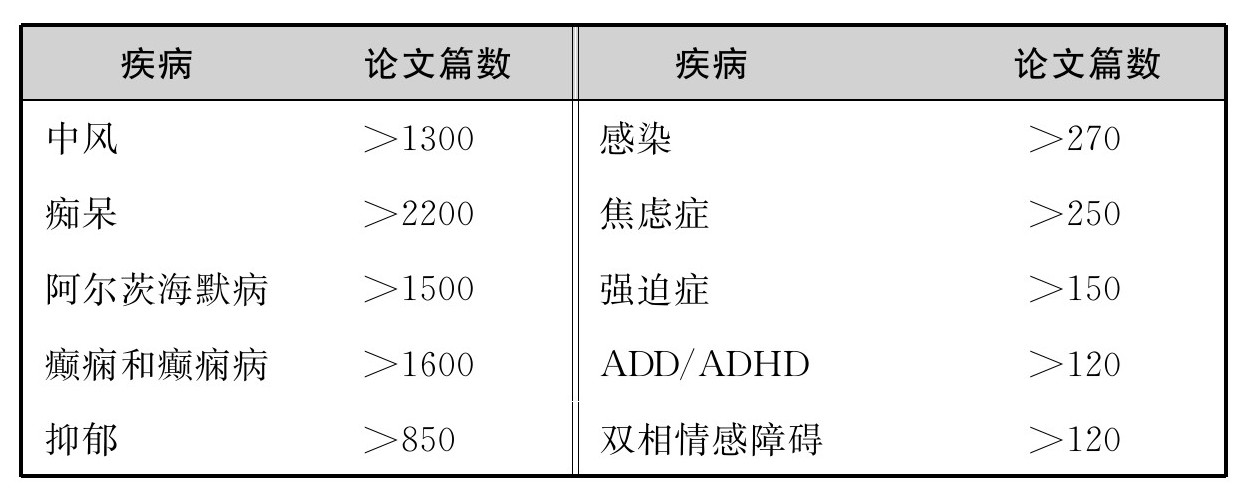 关于脑SPECT的研究非常广泛,医学文献网站Pubmed上已有14 000多篇论文。下表2-1显示了一些常见的神经和精神疾病领域的论文数量。