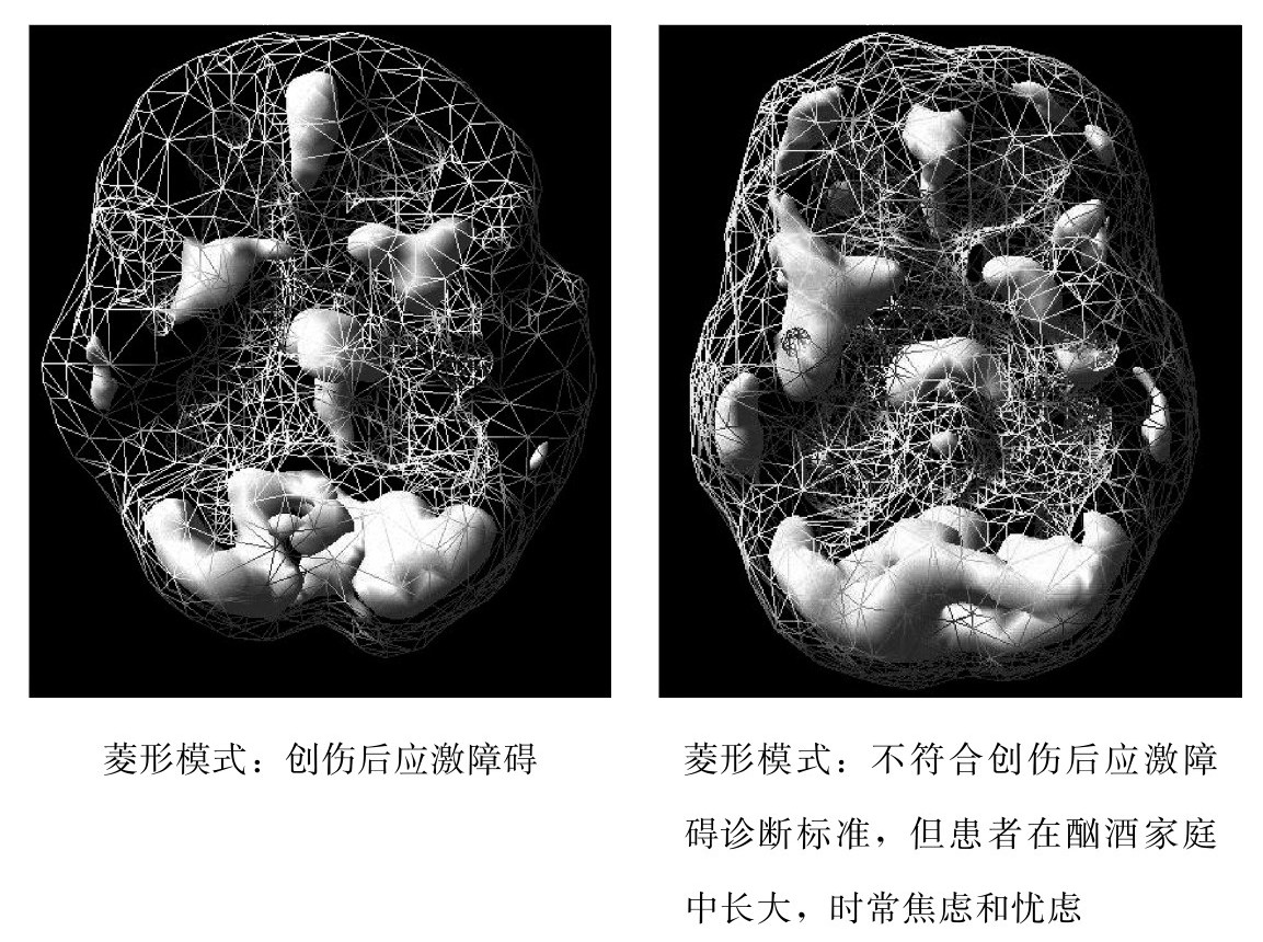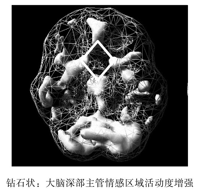 这种模式显示前扣带回(菱形顶部)、基底神经节(菱形侧面)和丘脑深处(菱形底部)的活动度增加
