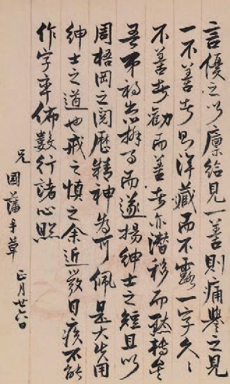 2. 宽厚谦恭,谨言慎行。 在缺乏民主的封建专制制度下,人人自危、明哲保身、但求无过的处世之道深入人心,因而传统家教无不叮嘱子弟要谦恭谨慎、宽厚待人。诸葛亮《诫子书》即言“夫君子之行,静以修身,俭以养德,非淡泊无以明志,非宁静无以致远。”张履祥说:“子孙以忠信谨慎为先,切戒狷薄。不可顾目前之利而妄他日之害,不可用一时之势而贻数世之忧”(《张园先生全集·训子语》)。真可谓经验之谈。